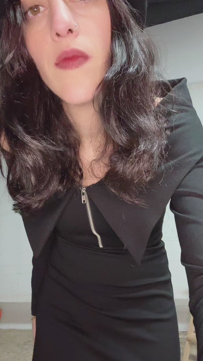 This elegant yet edgy Bardot dress is made to turn heads. With an off-the-shoulder neckline, a flattering fit and flare silhouette, and a bold metallic zipper detail at the neck, this piece blends timeless femininity with a modern, alternative edge. Perfect for cocktail parties, date nights, or everyday elegance.