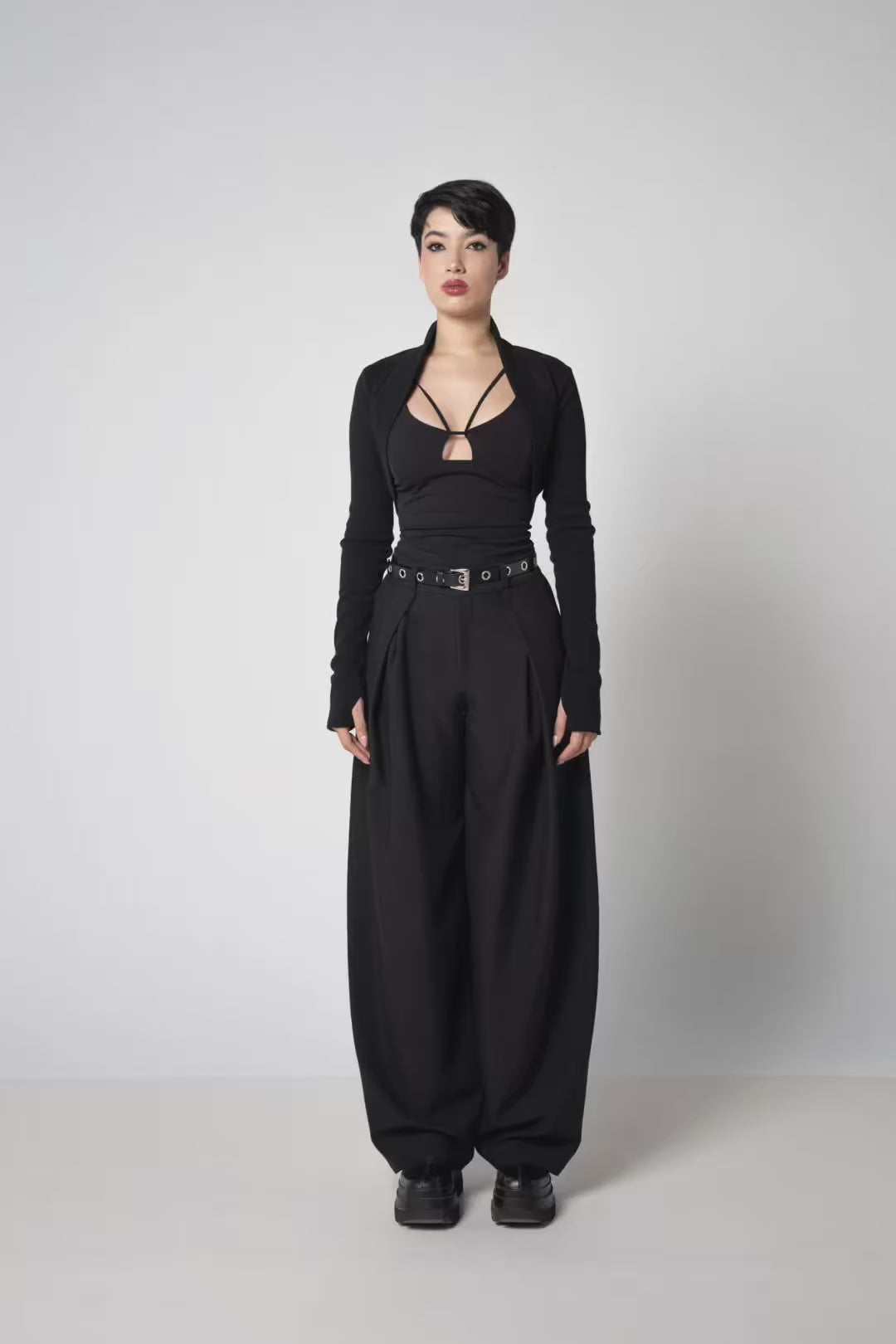 Tailored pleated barrel-fit pants made from recycled polyester. Designed with a flattering high waist and double-button closure for a perfect fit. A contemporary essential that blends structure, volume, and conscious craftsmanship.